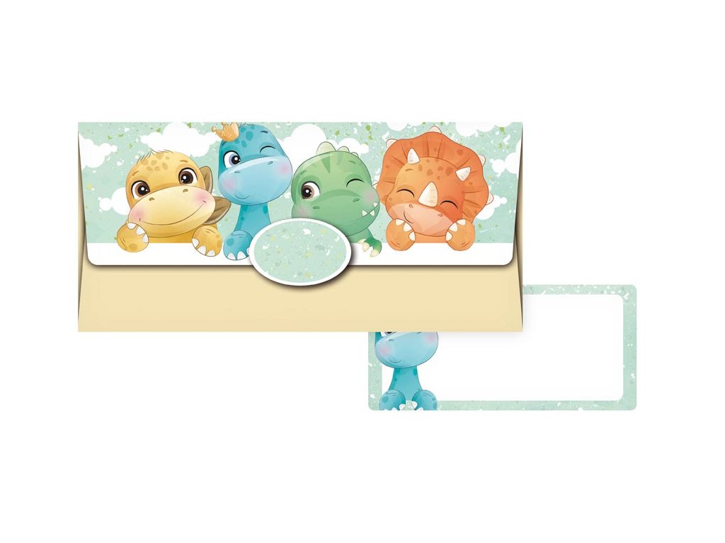 Dárková obálka na peníze v novém dětském designu a o 3,5 cm větší než starší modely. Udělejte oslavenci radost a věnujte mu obálku s penězi nebo dárkovým poukazem. Uvnitř je kartička bez textu, na kterou můžete napsat věnování. MOTIV: dinosauři.BARVA: béžová/zelená. Dodáváme v plastovém sáčku se závěsem. Uvedená cena je za 1 ks.Hmotnost: 0.01 kg. Rozměr: 180mm x 85mm x 2mm (Š x V x H).Vyrobeno v EU.Doplňkové parametry
