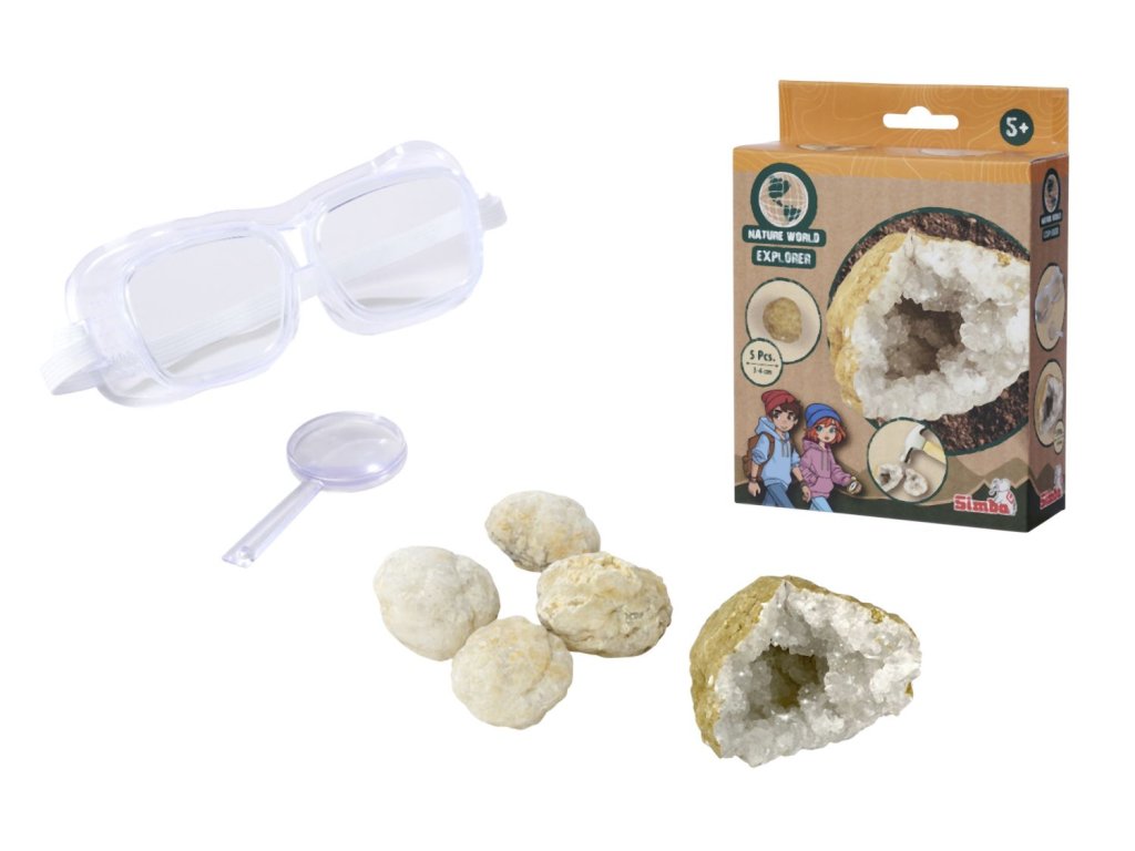 Sada na objevování geod, 5 ks opravdových geod o velikosti 3-4 cm. Součástí jsou ochranné brýle a lupa.Doplňkové parametry