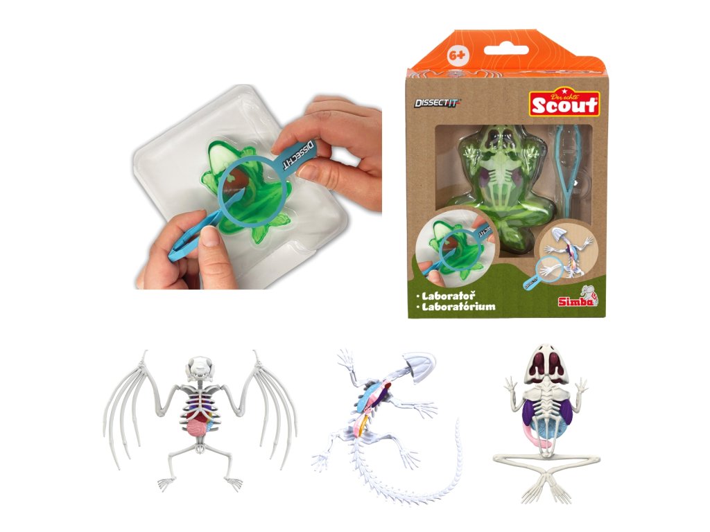 Malá laboratoř pro pitvu žáby, mloka či netopýra, jejichž kosti a orgány jsou pokryty slizem. Součástí je lupa a pinzeta a sáček s práškem pro vytvoření opětovného slizu: Po dokončení první pitvy vložte orgány a kostru zpět do blistru, promíchejte prášek s vodou, zalijte vzniklým slizem a nechte ztuhnout v chladu. Pitvu pak lze provést podruhé. Velikost 8 cm.Doplňkové parametry