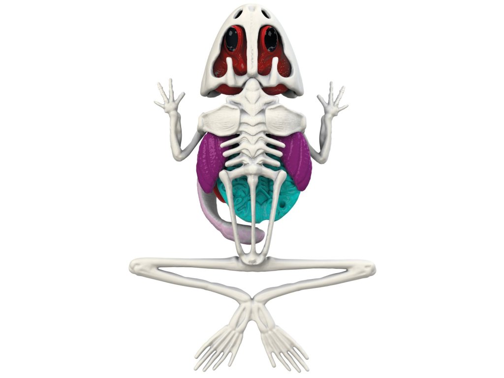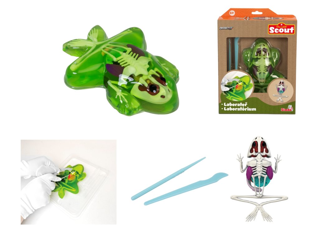 Sada s nástroji k pitvě žáby, jejiž kosti a orgány jsou pokryty zeleným slizem. Prvky lze vyjmout a prozkoumat jednotlivě. Součástí je sáček s práškem pro vytvoření opětovného slizu. Po dokončení první pitvy vložte orgány a kostru zpět do blistru, promíchejte prášek s vodou, zalijte vzniklým slizem a nechte ztuhnout v chladu. Žábu pak lze pitvat podruhé. Velikost 16 cm.Doplňkové parametry