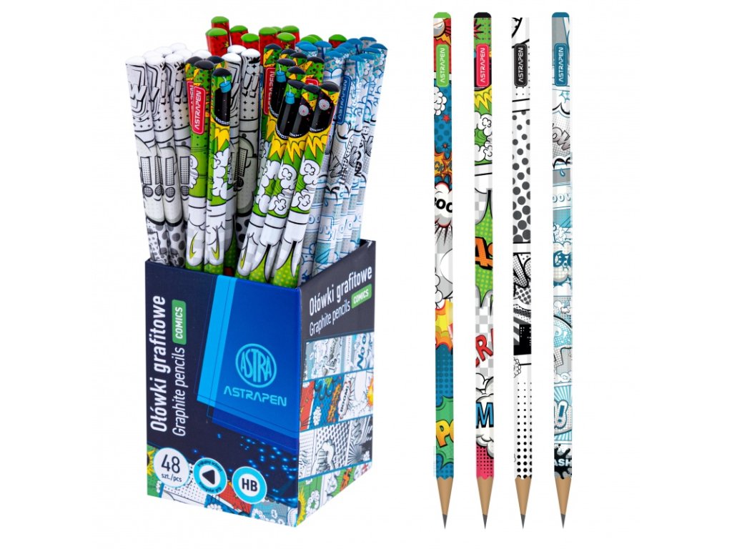 Klasická grafitová tužka AstraPEN Comics s trojhranným průřezem. Tvrdost HB, ergonomický design pro pohodlné psaní. Celý stojan obsahuje 48ks ve čtyřech různých designech.Kvalitní grafitová tužka značky AstraPEN Comics nabízí výjimečnou kvalitu a komfort při psaní. Díky trojhrannému tvaru dokonale sedí v ruce a snižuje únavu prstů při delším psaní.