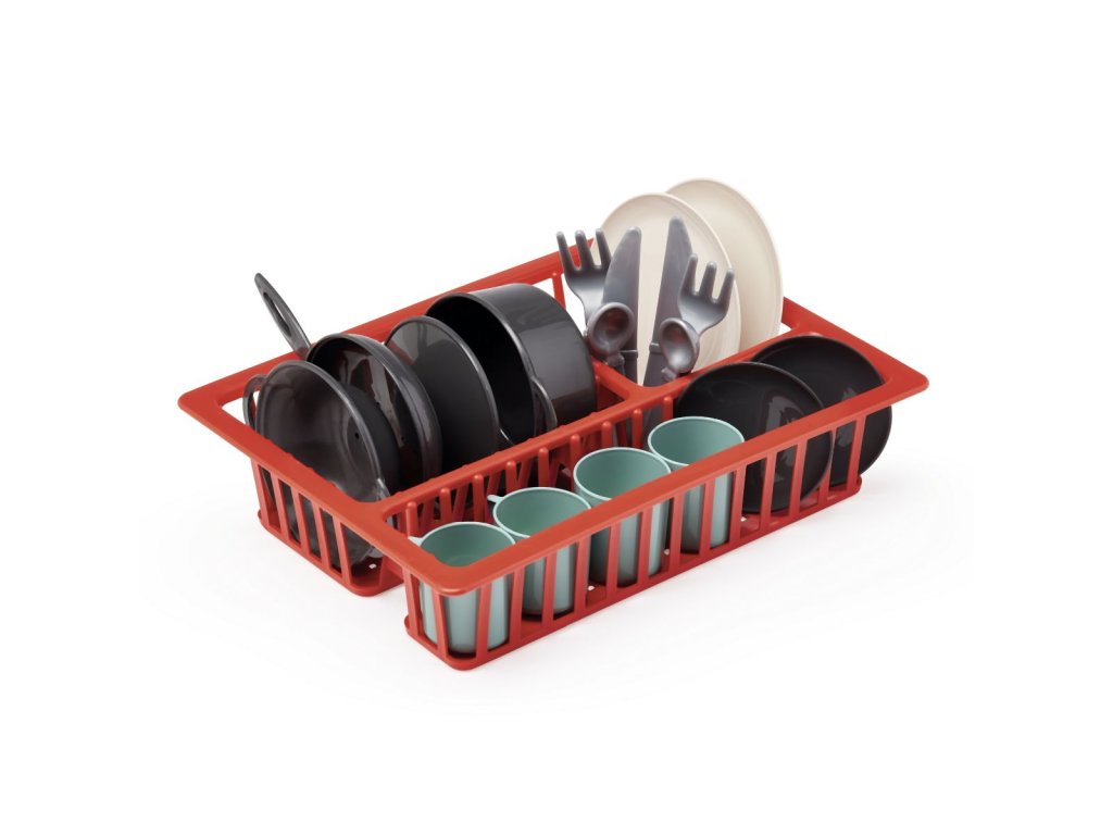 Odkapávač se sadou nádobí obsahuje talířky, příbory, šálky a kuchyňské nádobí. Rozměry odkapávače: 25x18,5x9,5 cm. Vše plastové.Doplňkové parametry