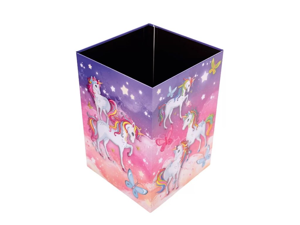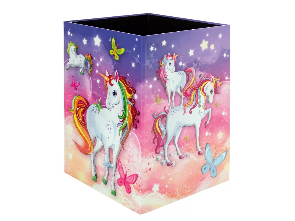 Popis Jednorožci jsou prostě kouzelní – bájní tvorové inspirují dívky i chlapce. Tento odpadkový koš s krásným designem v jemných odstínech fialové a růžové je hitem všech fanoušků jednorožců! Praktický a krásný na pohled, opravdový poutač pod dětským stolem. Odpadkový koš je vyroben ze silného kartonu a má objem 15 litrů, takže se vejde pod každý stůl. Potažený povrch umožňuje otírání a snadné čištění. Udržovat pořádek je snadné, a to i v dětském pokoji. S HERMA. Objevte produkty oblíbené řady Unicorn: desky, desky s motivy, psací bloky, samolepky a další! Láskyplně navržené, oblíbené u chlapců i dívek – vrchol dětského pokoje.Doplňkové parametry