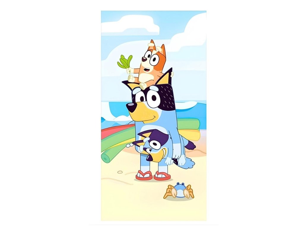 Plážová osuška s motivem Bluye. Rozměry: 70 x 140 cm. Materiál: 100% polyester, mikrofíbr, rychloschnoucí. Barva: multi. Výrobce: Aymax. Aymax 4760332 Charleroi Belgium info@aymax.beDoplňkové parametry