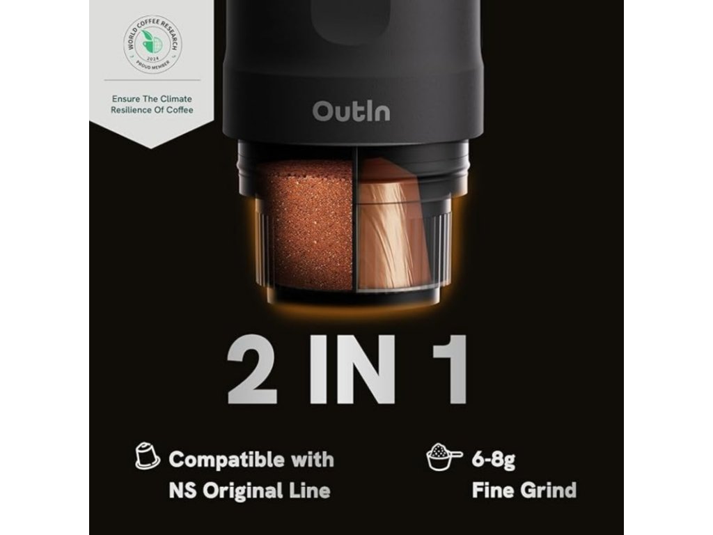Outin Nano - Přenosný kávovar pro dobrodruhy Prémiový přenosný kávovar s integrovanou baterií, který připraví dokonalé espresso kdekoli. Díky zabudovanému ohřívání nepotřebujete horkou vodu. Kompatibilní s mletou kávou i kapslemi Nespresso. S tlakem 20 barů a kapacitou baterie na 200 šálků je ideálním společníkem na cesty.