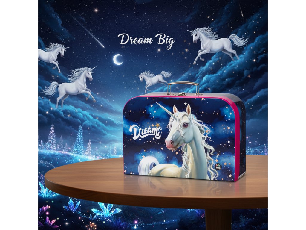 Kufřík lamino 34 cm s motivem Jednorožce (Unicorn) – kouzelný, stylový a praktický doplněk, který si zamiluje každá malá princezna! 🦄💖 Tento kufřík je ideální pro uložení školních i výtvarných potřeb a díky svému pohádkovému designu plnému třpytek a fantazie udělá radost hned na první pohled.