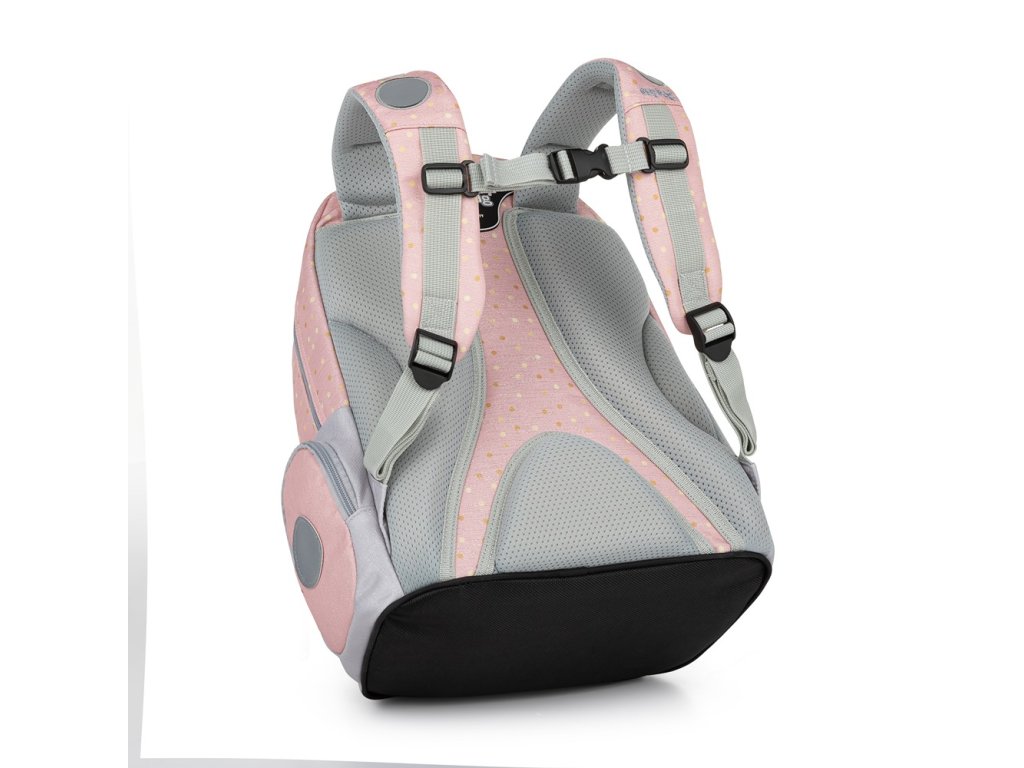 - Anatomicky tvarovaná záda: Batoh disponuje anatomicky tvarovanými zády s pevnou vnitřní výztuhou, která zajišťuje správné usazení a podporuje zdravý vývoj páteře.