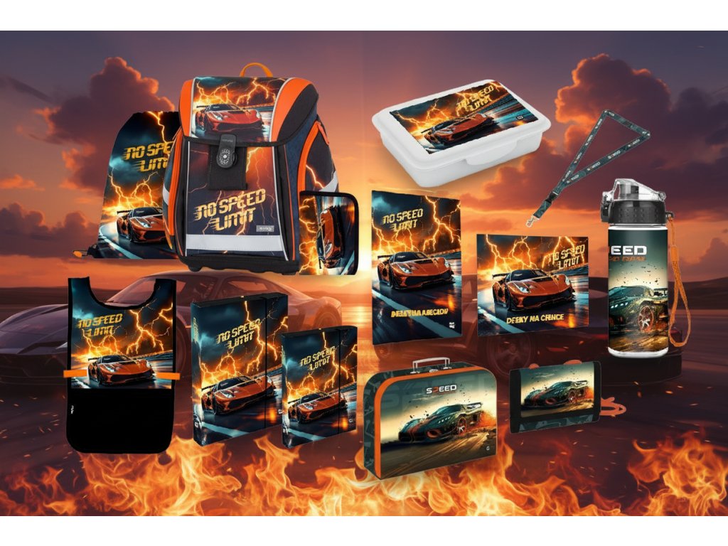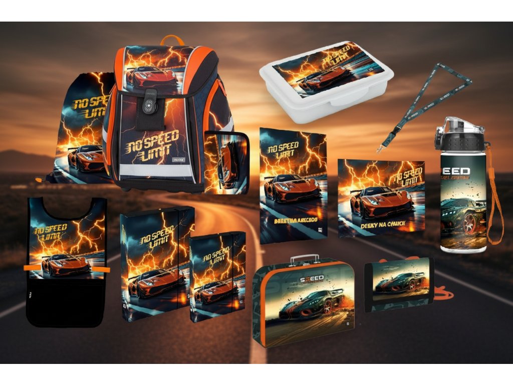 Oxybag Školní sada set 13 ks PREMIUM Auto batoh, penál, sáček a doplňky vhodný i pro prvňáčky 0-22726/013 - cenově zvýhodněný školní set obsahuje aktovku/batoh, penál, sáček, boxy na sešity, kufřík, zástěrku a láhev, peněženku, svačinový box, desky na čísla a písmena, klíčenka