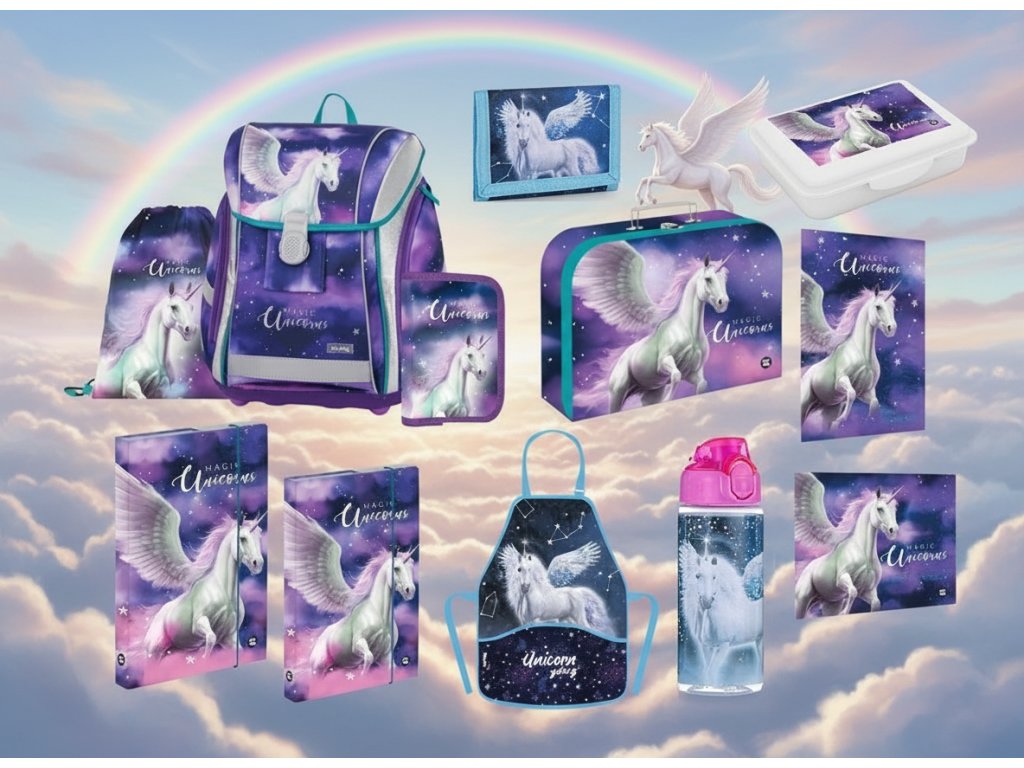 Školní set pro prvňáčka s motivem pegase. Set obsahuje školní batoh Premium, sáček na cvičky a nenaplněný jednopatrový penál, kufr, boxy na sešity, peněženku, zástěrku, láhev, svačinový box, desky na čísla a písmena