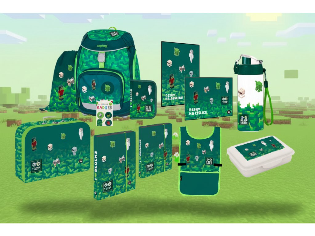 Oxybag Školní set 10ks OXY Sherpy Playworld ve stylu Minecraft sada batoh, penál a doplňky 0-24826/010 sada batoh, penál, sáček, placky, kufr, zástěrka, box na svačinu, boxy na sešity, láhev 0-24826/010