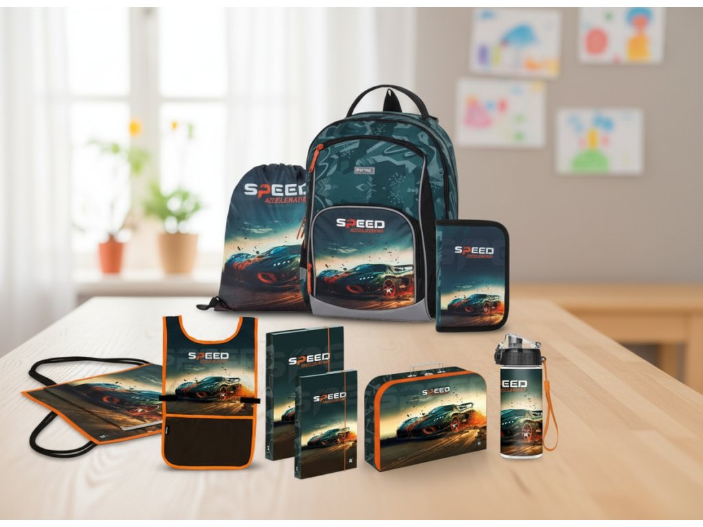 Oxybag Školní set sada 8 ks OXY GO Auto batoh, penál a doplňky 0-23725/08 - zvýhodněný školní set obsahuje batoh, penál, sáček, boxy na sešity, kufřík, zástěrku a láhev