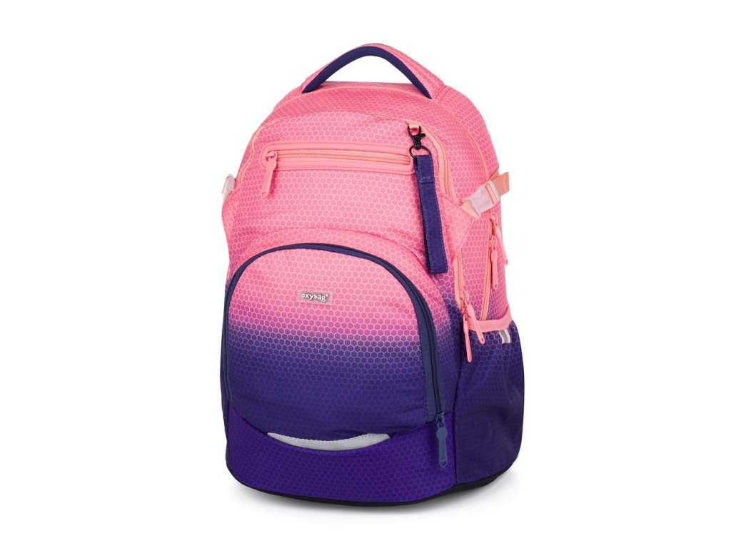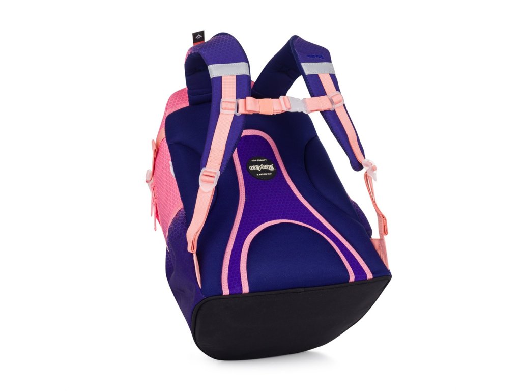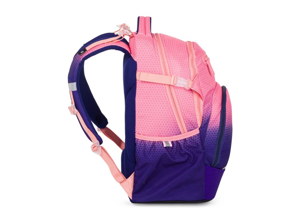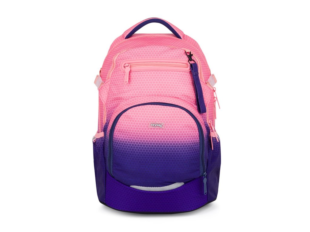 Školní batoh z řady OXY Ombre je ideální pro školáky od 3. třídy. Moderní design ve stylu ombre zaujme na první pohled. Anatomicky tvarovaný zádový panel, polstrované ramenní popruhy a nastavitelný hrudní popruh zajistí záda jako v bavlnce každému školákovi. Pevné dno zabraňuje převrhnutí samostatně stojícího batohu. Batoh disponuje dvěma prostornými kapsami na všechny potřebné školní pomůcky. V bočních postranních kapsách na gumu je prostor pro láhev na pití, která je snadno dostupná pro doplnění pitného režimu každého školáka. Do přední kapsičky se snadno schová menší svačina. Nechybí řada reflexních prvků. Batoh je vhodný pro děti vysoké od 136 cm. Délka zádového panelu je 43 cm, objem činí 28 l, hmotnost batohu je 960 g a jeho nosnost je 8 kg.