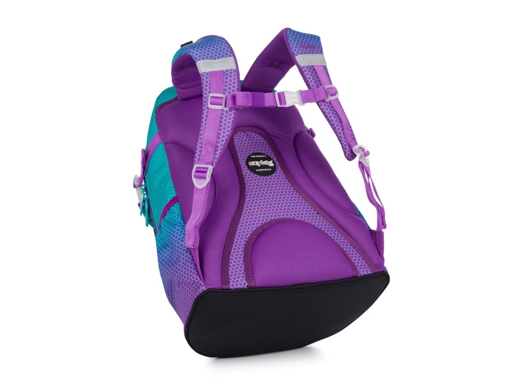 Školní batoh z řady OXY Ombre je ideální pro školáky od 3. třídy. Moderní design ve stylu ombre zaujme na první pohled. Anatomicky tvarovaný zádový panel, polstrované ramenní popruhy a nastavitelný hrudní popruh zajistí záda jako v bavlnce každému školákovi. Pevné dno zabraňuje převrhnutí samostatně stojícího batohu. Batoh disponuje dvěma prostornými kapsami na všechny potřebné školní pomůcky. V bočních postranních kapsách na gumu je prostor pro láhev na pití, která je snadno dostupná pro doplnění pitného režimu každého školáka. Do přední kapsičky se snadno schová menší svačina. Nechybí řada reflexních prvků. Batoh je vhodný pro děti vysoké od 136 cm. Délka zádového panelu je 43 cm, objem činí 28 l, hmotnost batohu je 960 g a jeho nosnost je 8 kg.
