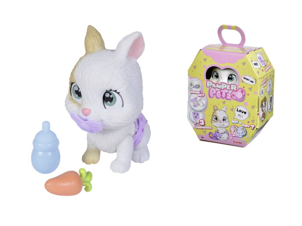 Roztomilé miminko králíčka s picí a čůrací funkcí, plenka s funkcí změny zbarvení po namočení, magická tlapka (po navlhčení se vybarví a ukáže pohlaví králíčka), adopční list a tři překvapení. Velikost 15 cm.Doplňkové parametry