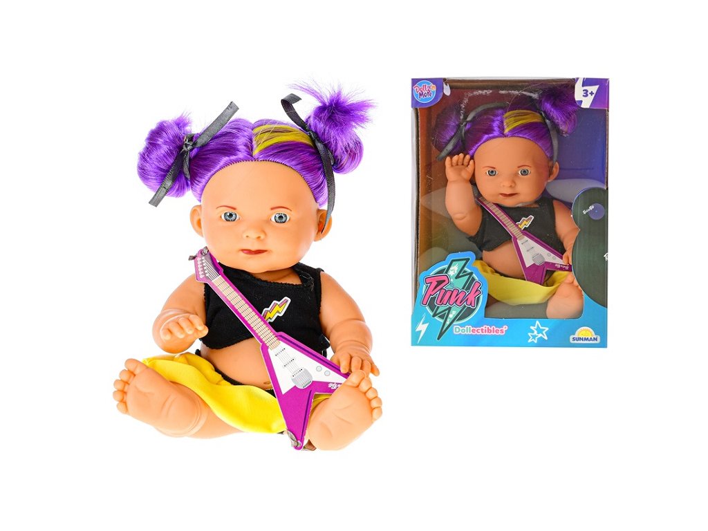 Roztomilá panenka s fialovými culíky a kytarou. Velikost panenky: 23 cm Materiál: plast Baleno v krabičce. Vhodné pro děti od 3 let.Doplňkové parametry