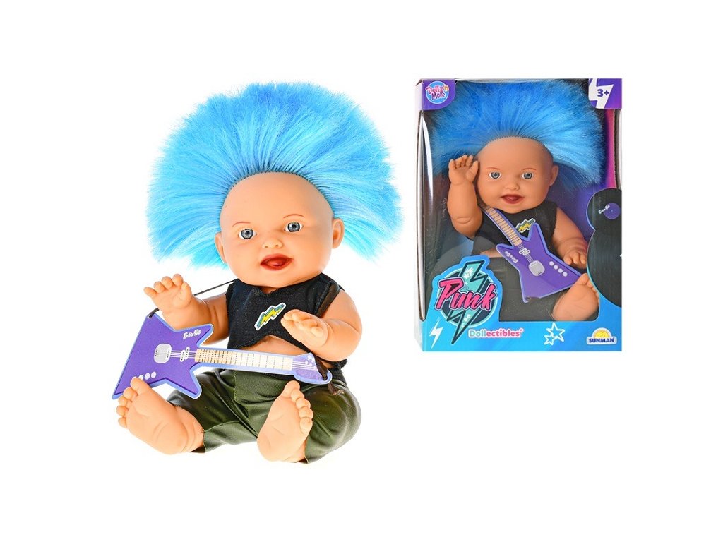 Roztomilá panenka s modrým punk účesem a kytarou. Velikost panenky: 23 cm Materiál: plast Baleno v krabičce. Vhodné pro děti od 3 let.Doplňkové parametry