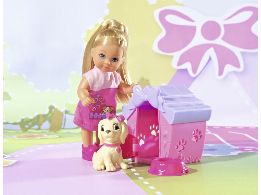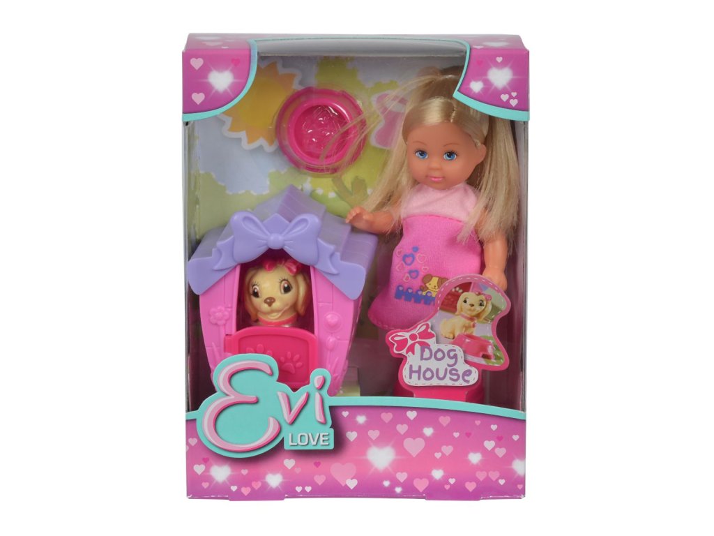 Panenka Evička má psího mazlíčka, který dostal novou boudu. Výška panenky: 12 cm.Doplňkové parametry