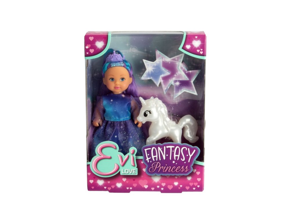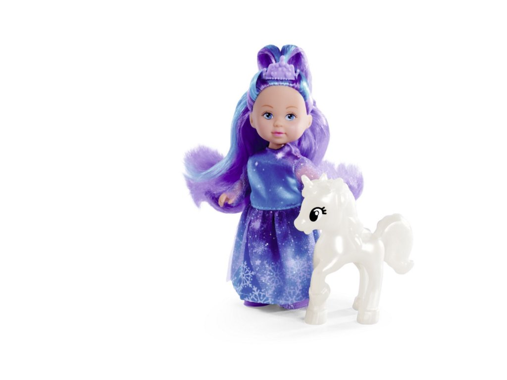 Panenka Evička jako Fantasy princezna v třpytivých šatech s bílým jednorožcem. Výška panenky 12 cm.Doplňkové parametry