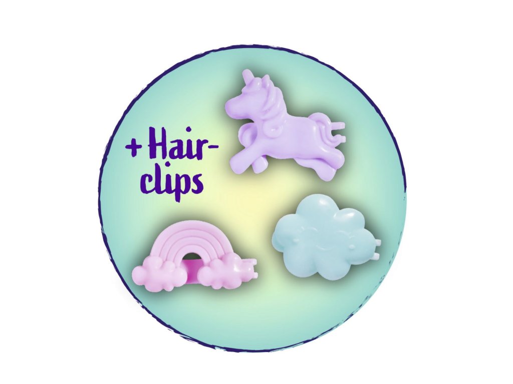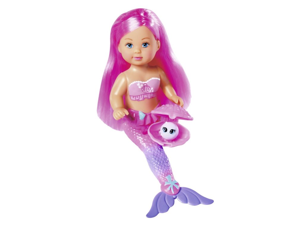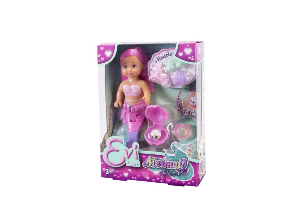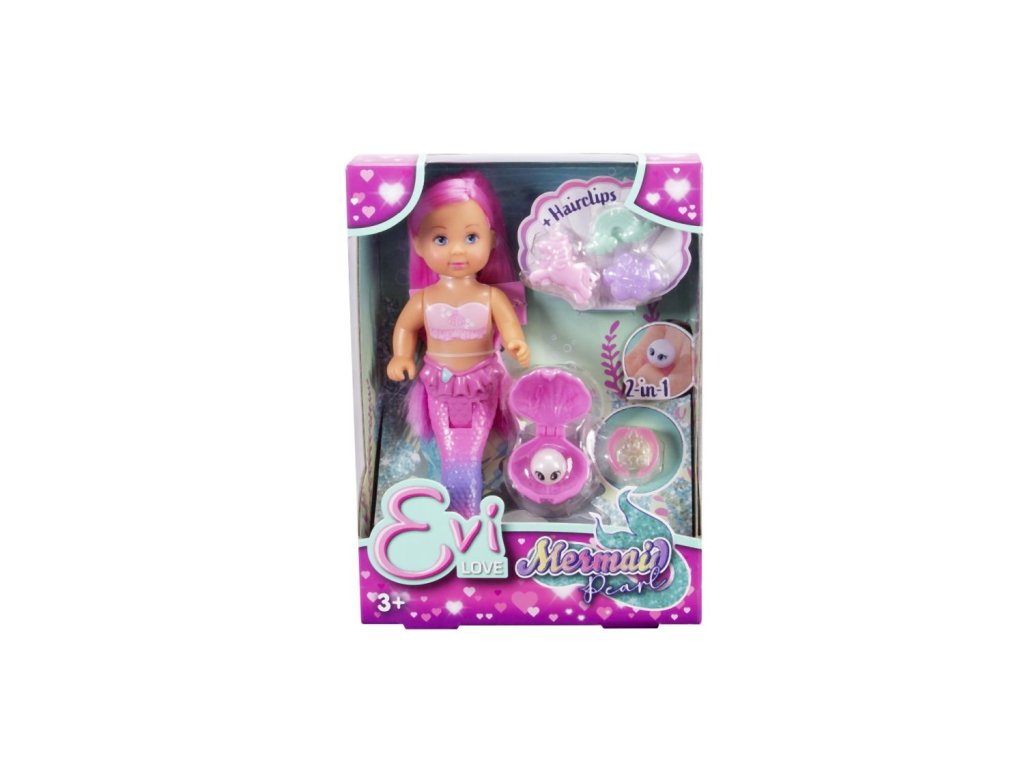 Panenka Evička mořská víla s dlouhými růžovými vlasy, se třemi klipy do vlasů (obláček, duha, jednorožec) a mušlí s perlou, kterou lze použít jako ozdobu prstenu (prstýnkový kroužek součástí balení). Velikost panenky 12 cm.Doplňkové parametry