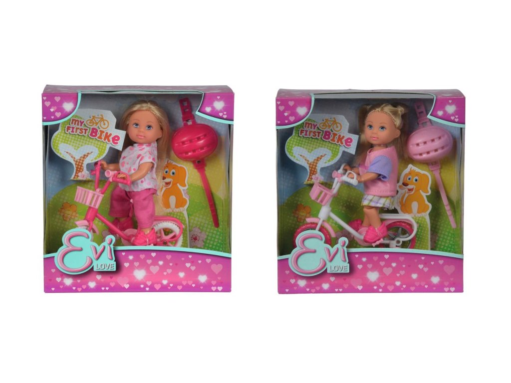 Panenka Evička na jízdním kole s balančními kolečky. Nechybí cyklistická helma ani láhev. Výška panenky 12 cm.Doplňkové parametry