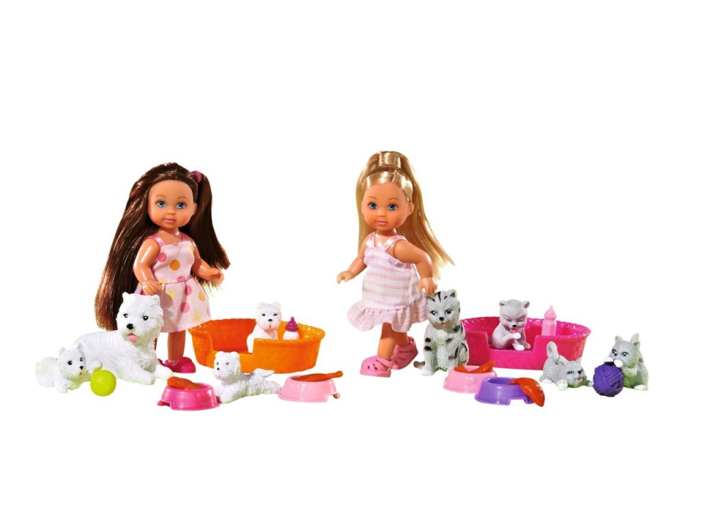 Panenka Evička s domácím mazlíčkem. Obsahuje 4 zvířátka a doplňky. S pejsky nebo s kočičkami. Výška panenky 12 cm.Doplňkové parametry