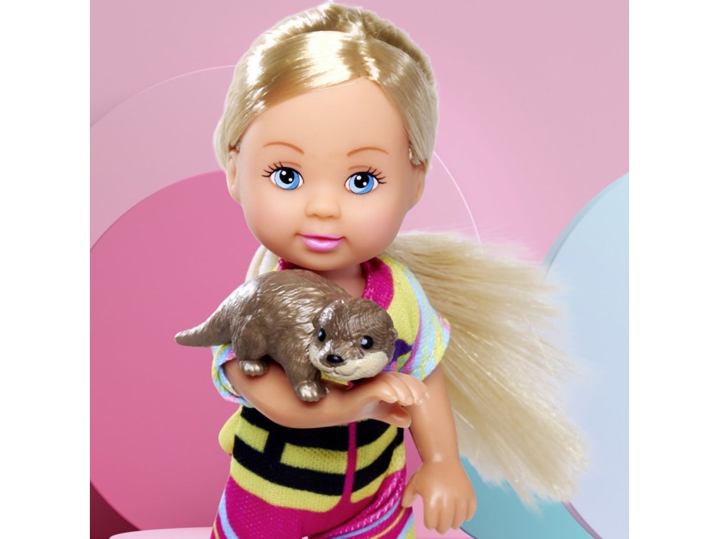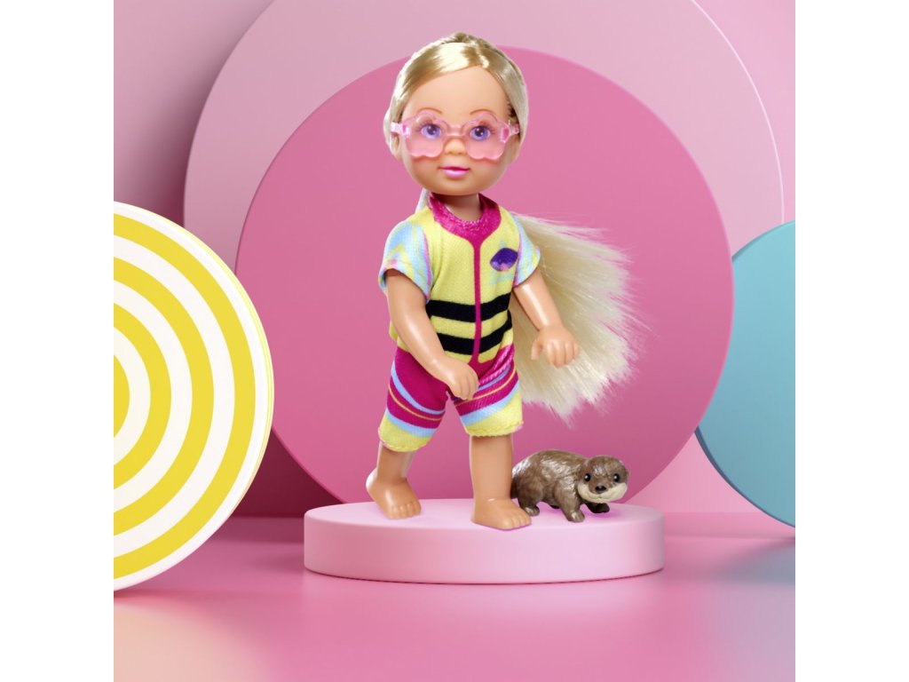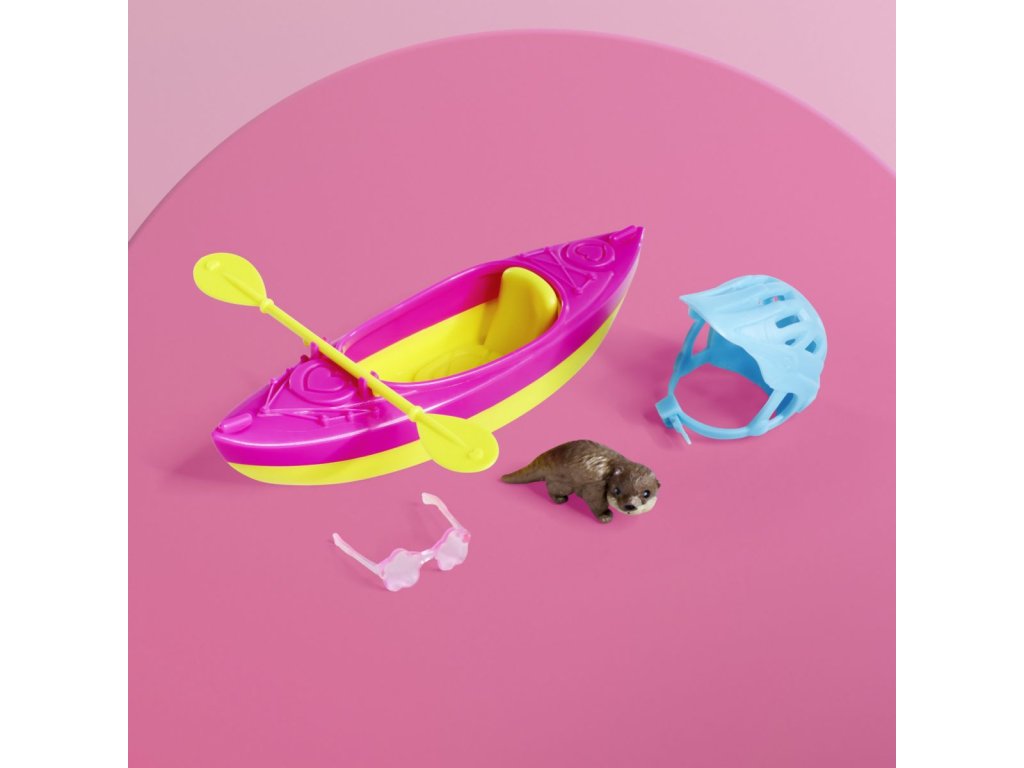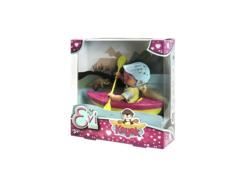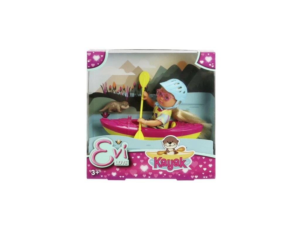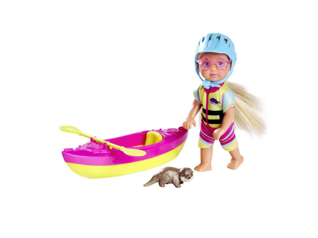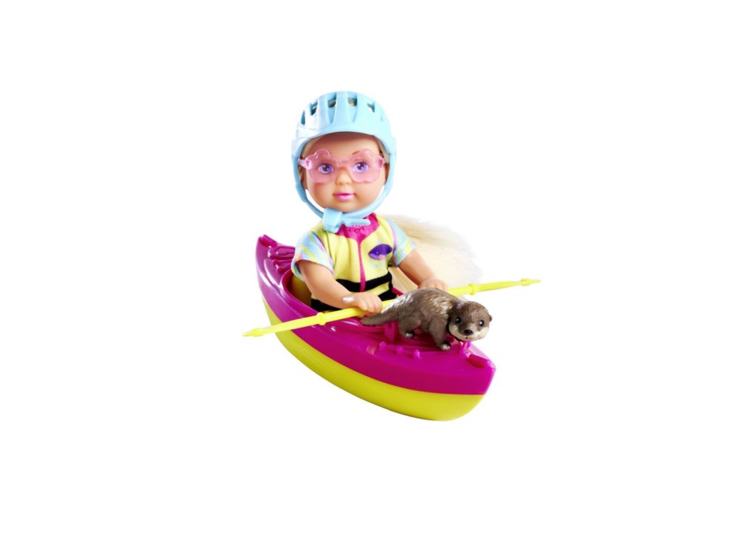Panenka Evička připravená na výlet s kajakem. Součástí balení je oblečení, kajak, helma, pádlo, sluneční brýle a vydra. Velikost panenky 12 cm.Doplňkové parametry