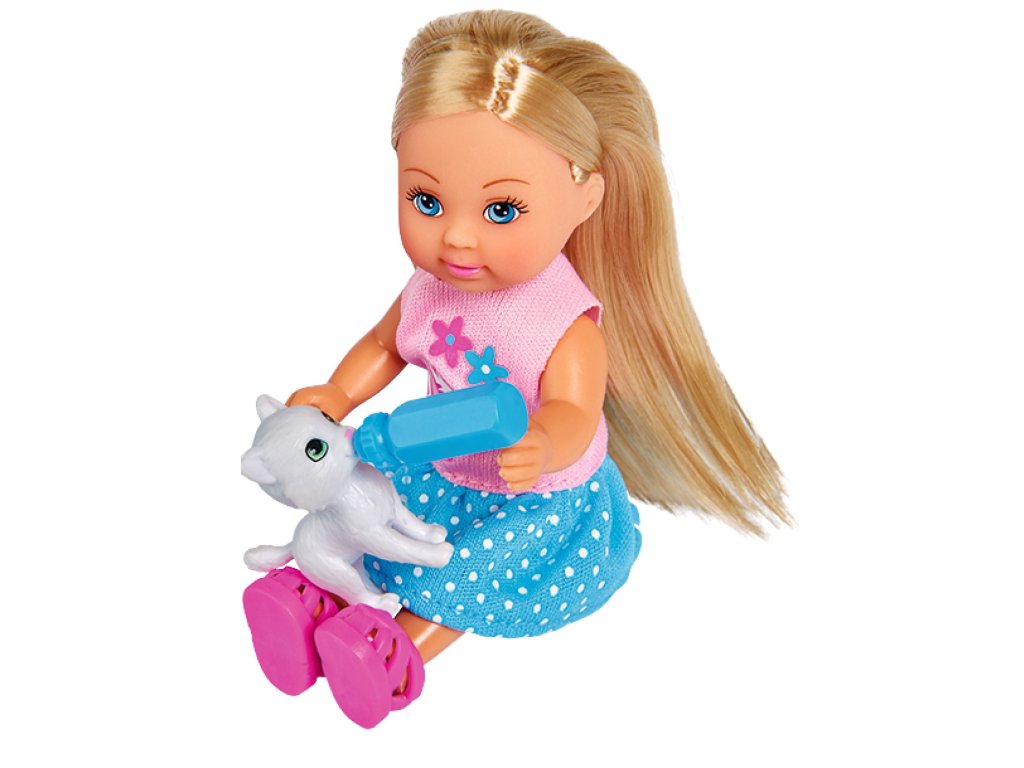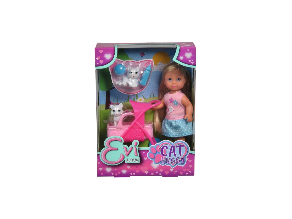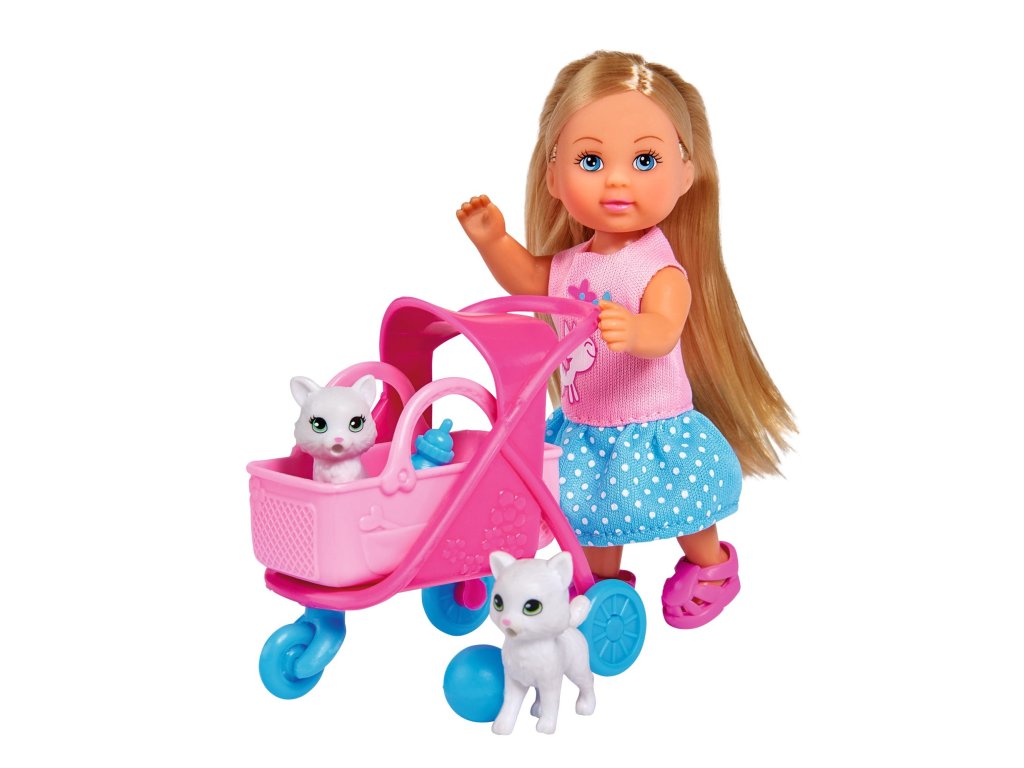 Panenka Evička se 2 roztomilými kočičkami a kočárkem s odnímatelným košíkem a doplňky. Velikost panenky 12 cm.Doplňkové parametry