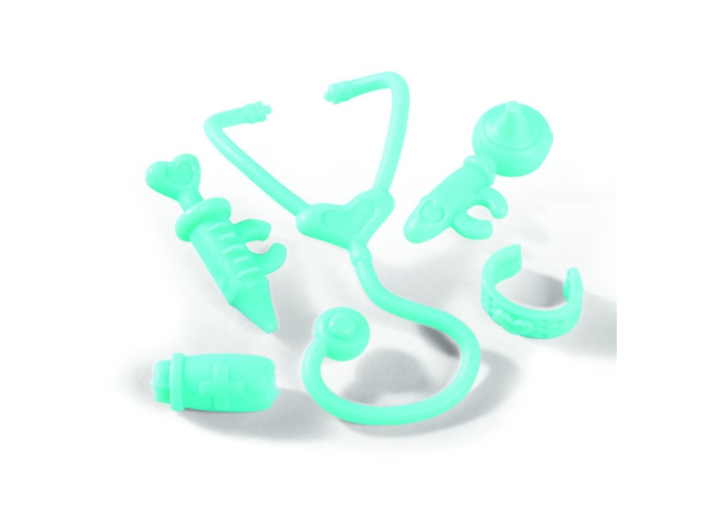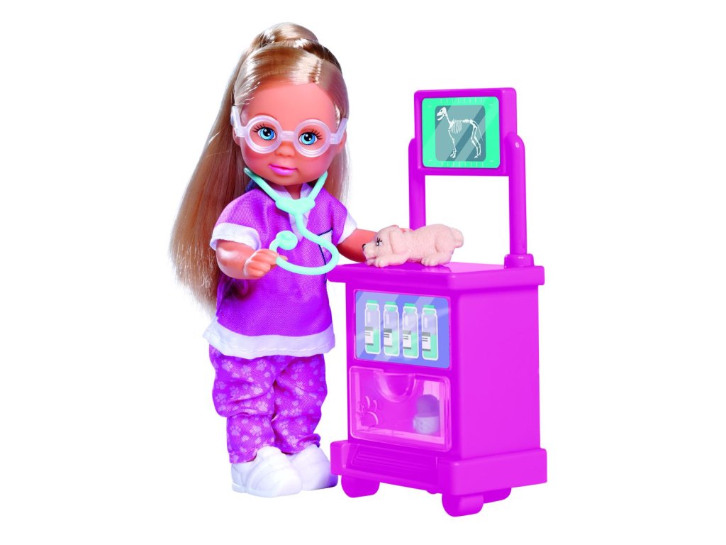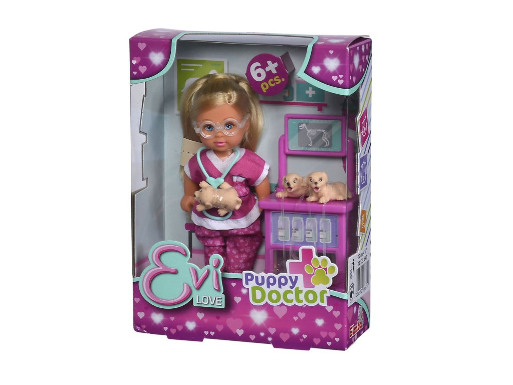 Panenka Evička jako veterinářka s brýlemi, 3 štěnátky a vyšetřovacím stolkem. Nezbytné příslušenství součástí. Výška panenky 12 cm.Doplňkové parametry