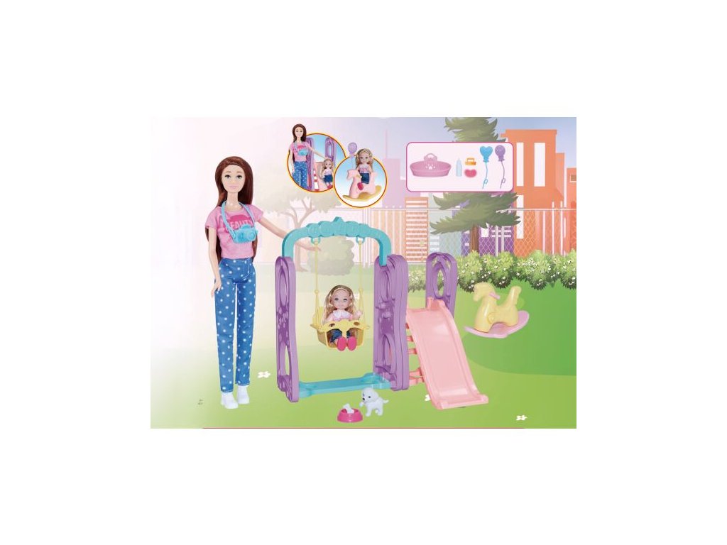 Panenka s dítětem na hřišti. Velikost panenky 30 cm. Obsahuje panenku, holčičku, houpačku, skluzavku, houpacího koníka, štěňátko a doplňky.Doplňkové parametry
