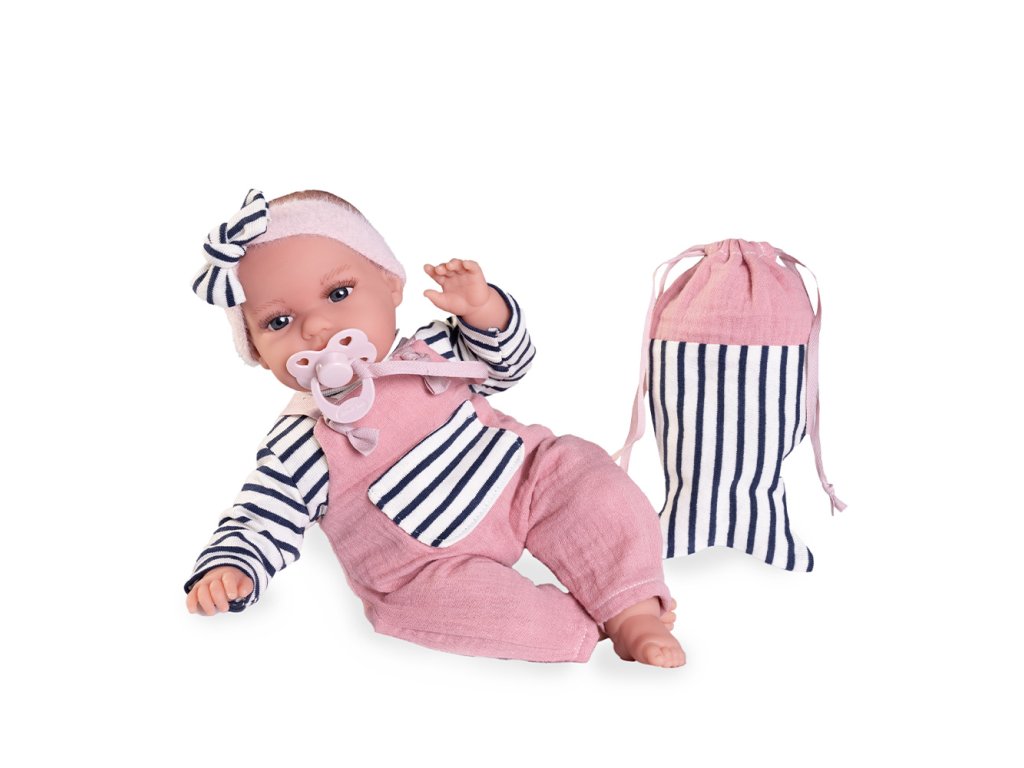 Toneta má na sebe ružový pruhovaný outfit a tašku v tvare rybky, do ktorej si môžete odložiť veci, keď s ňou pôjdete na prechádzku.