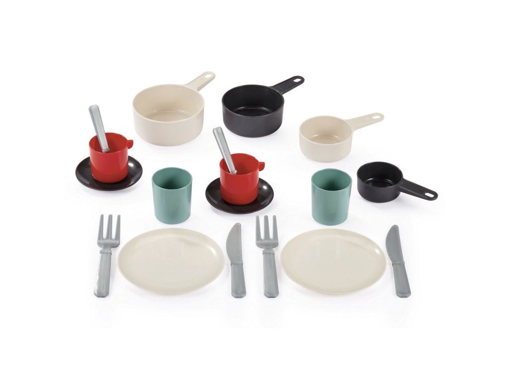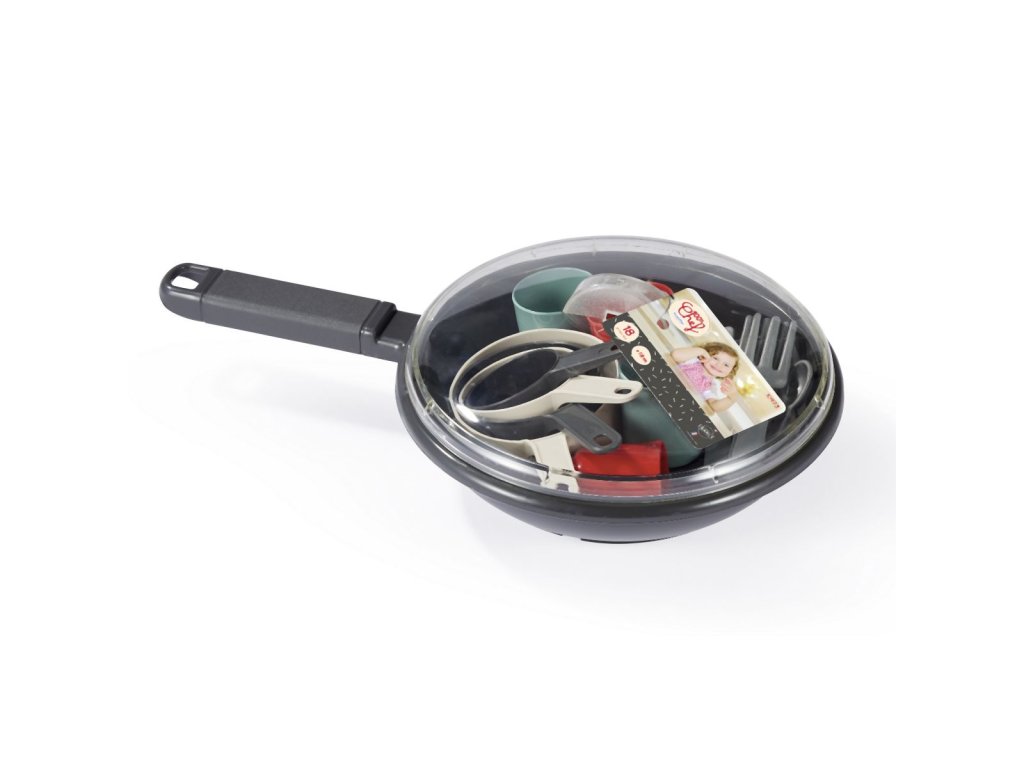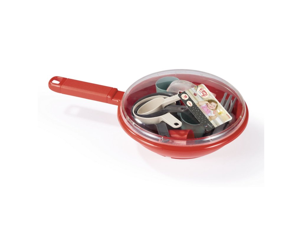 Pánvička s pokličkou a sadou nádobí obsahuje talíře, příbory, hrníčky, lžičky a další. Vyrobeno ve Francii. Materiál plast. Průměr pánvičky cca 20 cm. Barva černá nebo červená.Doplňkové parametry