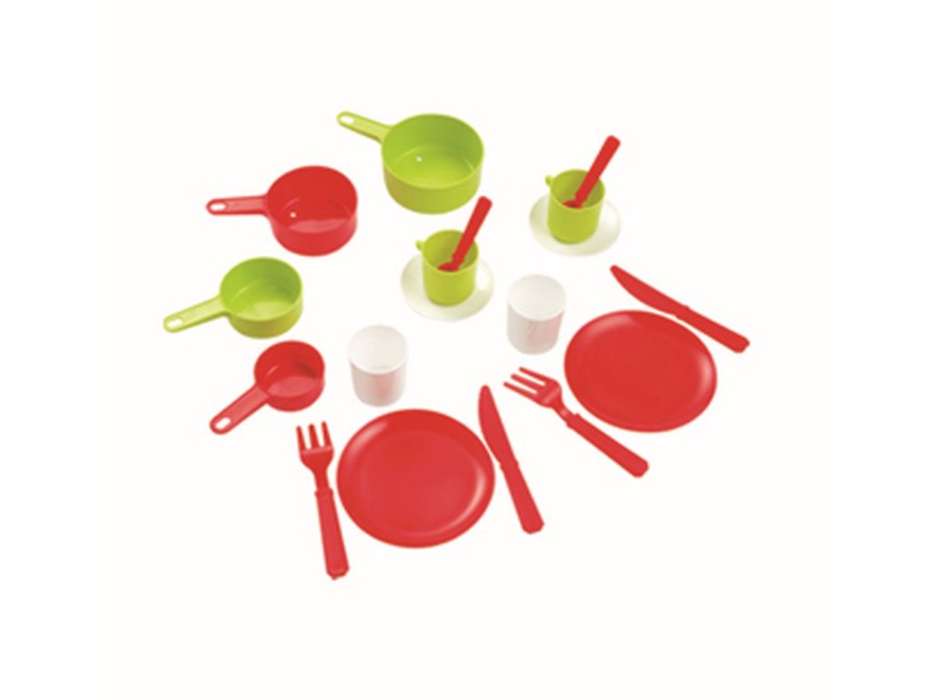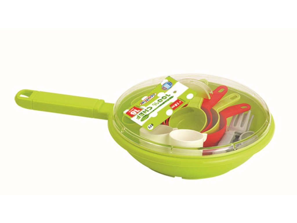 Pánvička s pokličkou a sadou nádobí obsahuje talíře, příbory, hrníčky, lžičky a další. Vyrobeno ve Francii. Materiál plast. Průměr pánvičky cca 20 cm. Barva pánvičky zelená nebo šedá.Doplňkové parametry