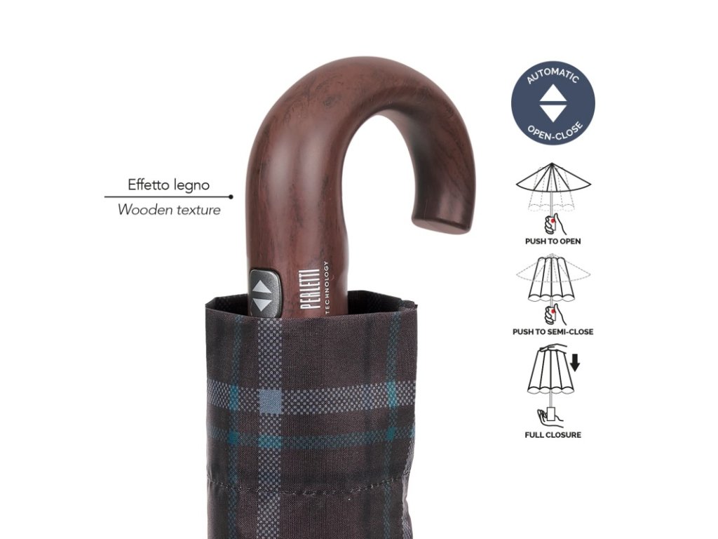 Hledáte doplněk do deště, který spojuje modernost a eleganci? Vytvořili jsme tento skládací a ultralehký deštník se skotským vzorem a pohodlnou zahnutou rukojetí s dřevěným efektem, který je dokonalý i pro nejnáročnějšího muže.Hlavní přednosti: