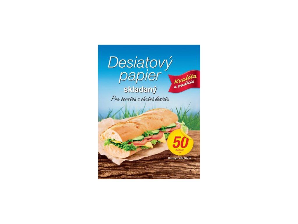 Desiatový papier je vhodný na balenie desiaty deťom do školy, na výlety, môže sa používať i pri pečení rôznych múčnikov. Balenie obsahuje 50 hárkov 45x30 cm.Doplňkové parametry