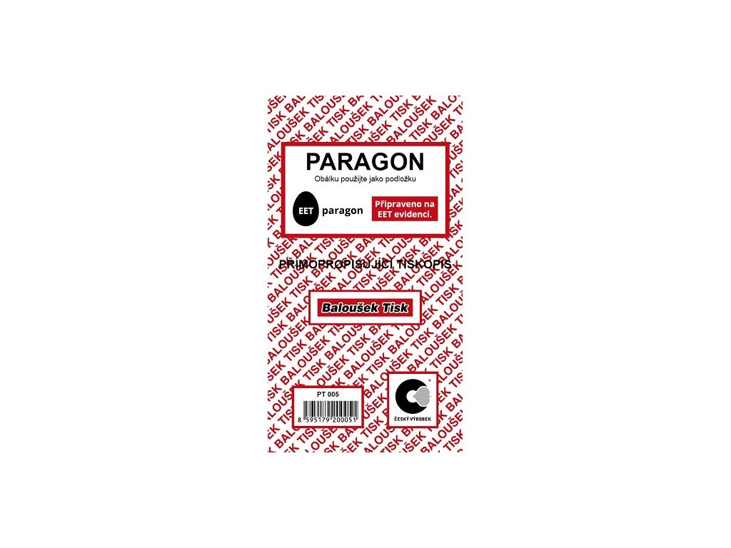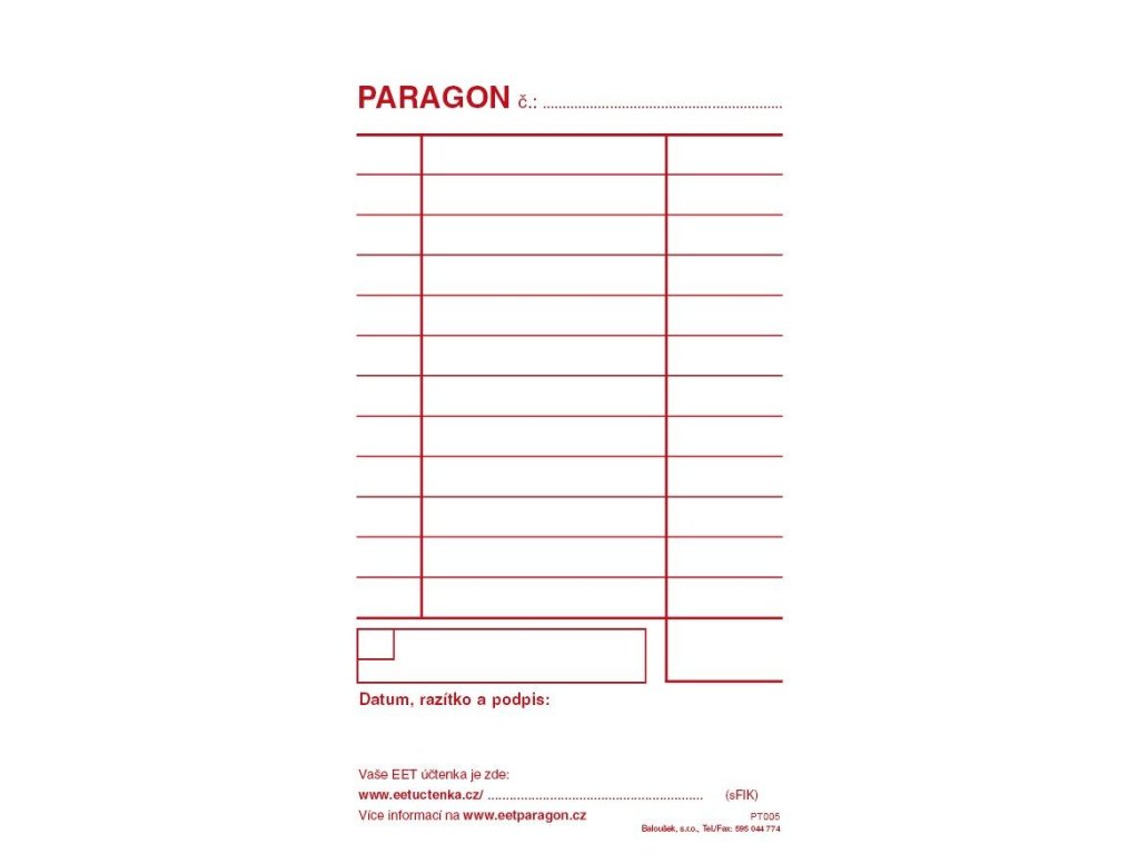 Paragon - tiskopis je vyroben ze samopropisujícího papíru. Tisk vnitřních listů je červenou barvou.Doplňkové parametry