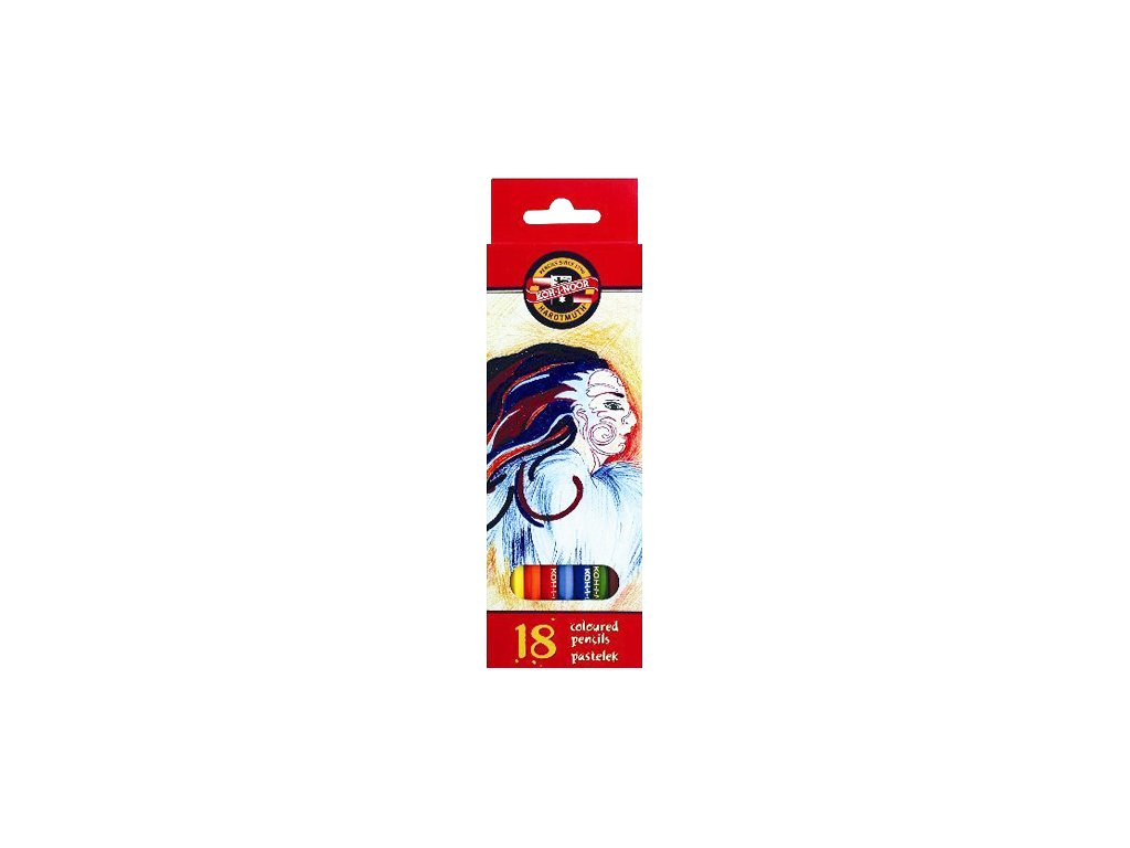 18-kusová sada školních pastelek s dobrou krycí schopností s dřevěným tělěm standardní kvality, dodávaná v papírovém boxu s eurpzávěsem.Doplňkové parametry