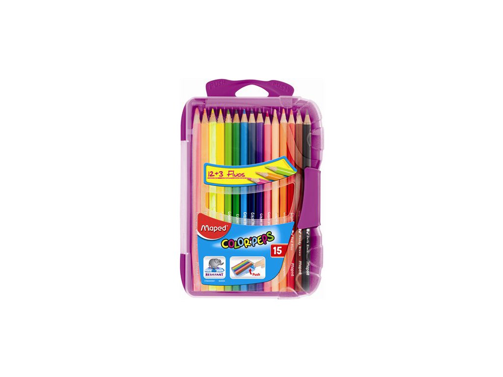Pastelky v boxu, který je odolný proti rozbití. Trojhranné tělo pastelky umožňuje pohodlné uchopení. Měkká a odolná tuha, jasné barvy. Balení obsahuje 15 ks pastelek, gumu a ořezávátko. Pant boxu umožňuje otáčení víčka o 360 stupňů. Pákový systém pro lepší přístup k tužce. Šířka tuhy: 2,9 mm. Francouzská značka MAPED zaručuje vysokou kvalitu, funkčnost a moderní design.Doplňkové parametry