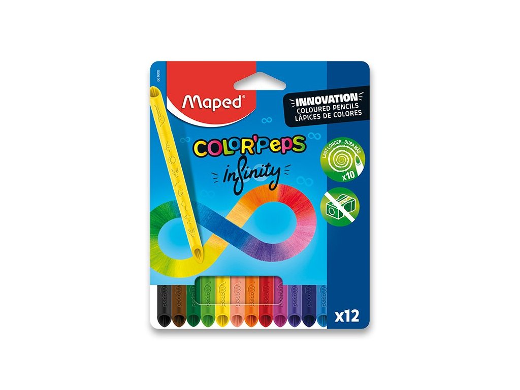 Souprava 12 ks bezdřevých pastelek Maped Color'Peps Infinity pastelek s originálním patentovaným designem, který umožňuje kreslit oběma stranami. Pastelky tvoří 100% tuha a není nutné ji ořezávat a mají tedy nulový odpad. Ostří se samy při vybarvování. Pastelky mají trojhranné tělo pro snadný a pohodlný úchop a jasné barvy.Doplňkové parametry