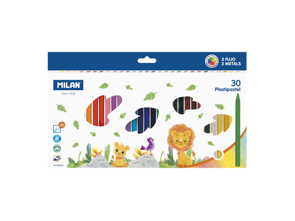 Milan Plastipastel pastelky 30 ks (25 pastelek MILAN + 3 fluo + 2 metalické barvy). Plastové pastelky s kulatým tělem v zářivých barvách s velkou kryvostí.Doplňkové parametry