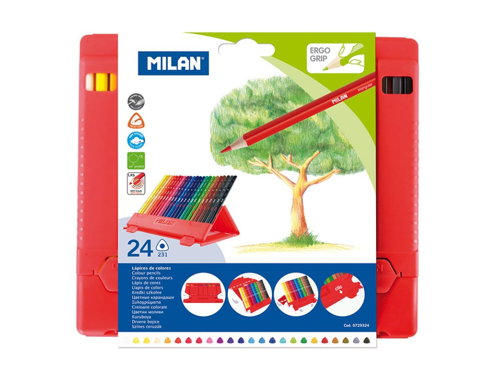 Ergonomicky tvarované pastelky, trojhranné pro lepší uchopení - 24 ks balení. Pastelky jsou baleny ve snadno přenosné krabičce odolné proti nárazu či rozbití, která zároveň funguje jako lehce skládatelný a praktický stojan. Pastelky se vyznačují technologiemi LPS (Lead protection system), který zabraňuje nechtěnému zlomení tuhy při nešetrném zacházení.Doplňkové parametry