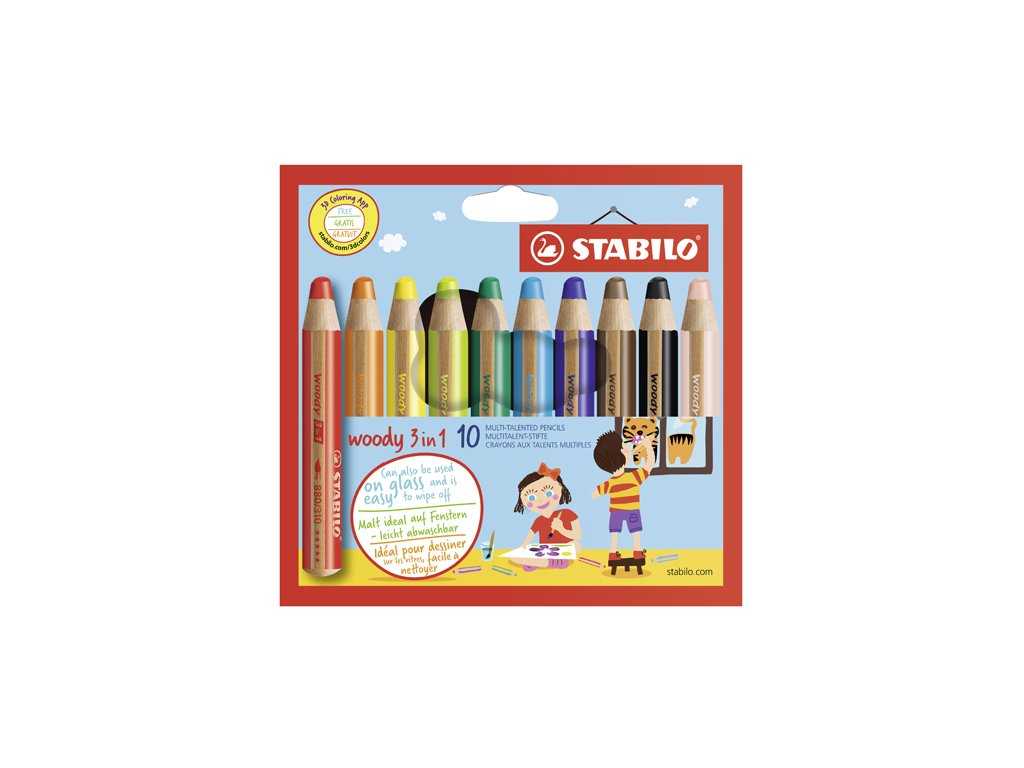 Woody 3 v 1 je barvička, vodovka a voskovka v jednom, která umí kreslit na papír, na tmavý podklad, karton, sklo, kov, dřevo nebo třeba i na gumáky. 10 ks různých barev. Ozdobit si dřevěný rámeček, okno, chlebník nebo plechovku na tužky je hračka. Děti ji milují a rodiče mohou zůstat v klidu, protože barvu lze z ručiček iz hladkého povrchu dobře smýt vodou s mýdlem nebo saponátem. Tuha obsahuje osmkrát více barvy než běžná barvička, nelze ji zlomit a hodí se na extra dlouhé kreslení.Doplňkové parametry
