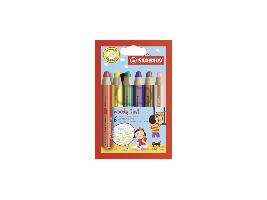 Pastelky STABILO woody 3 v 1 - barvička, vodovka, voskovka - 6 ks různých barev