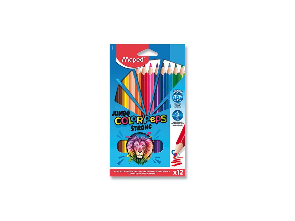 Pastelky trojhranné MAPED "COLOR'PEPS STRONG JUMBO". Výborná krycí schopnost. Pohodlně se drží. Tuhy jsou odolné proti lámání. snadno se strouhají. Trojúhelníkový tvar nabízí snadné uchopení a je ideální pro děti, které jsou nadšené uměním, které chtějí kreslit, vybarvovat, zdobit a obohatit své kresby. Průměr tuhy 4 mm. Balení obsahuje 12 ks.Doplňkové parametry