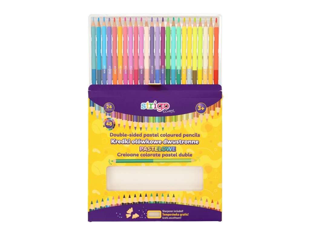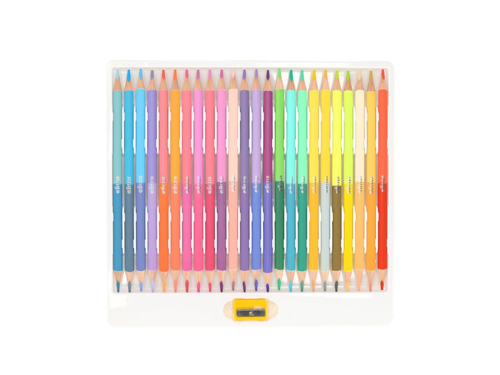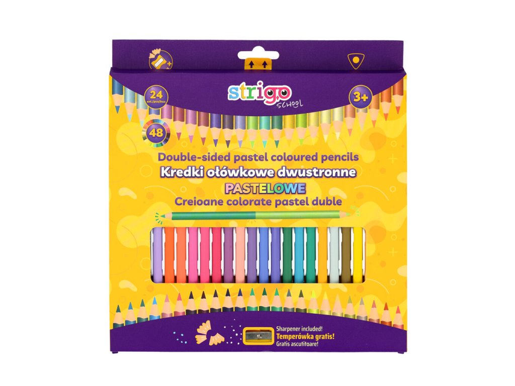 24 dvoubarevných oboustranných pastelek, 48 barev, vyrobených z měkkého lipového dřeva. Vnitřní grafit má tloušťku 3,0 mm. Ořezávátko je součásti balení.Doplňkové parametry