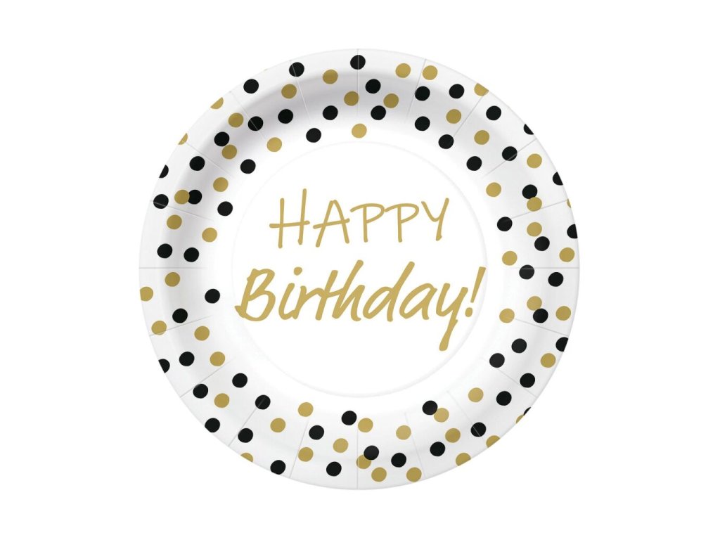 Papírové talíře Birthday Confetti Golg-Black, průměr 23 cm, balení obsahuje 10ks. Papírové talíře jsou ideálním řešením pro snadné stolování bez nepořádku.Doplňkové parametry