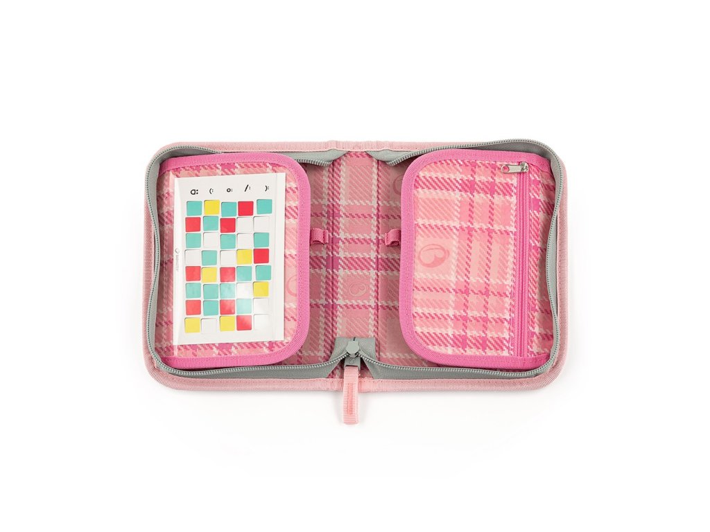 Dvouklopý školní penál včetně rozvrhu a samolepek pro žáky 1. stupně (nenaplněný).