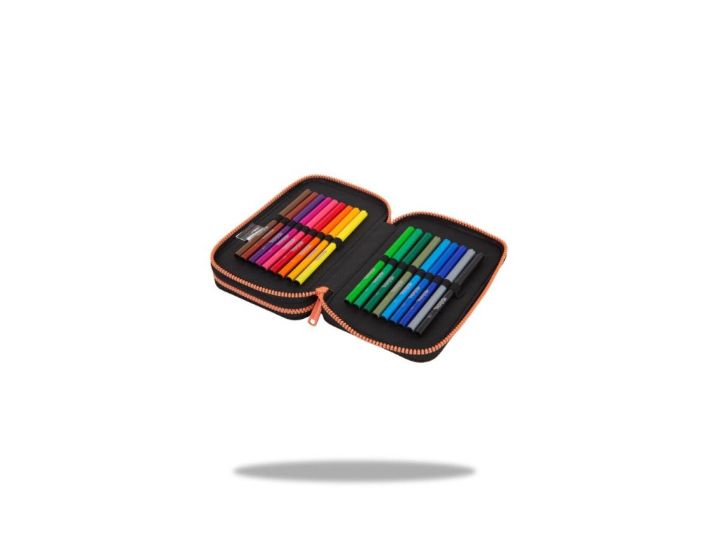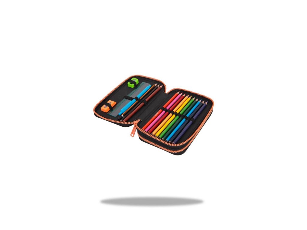Vybavený 2 zipý školní penál CoolPack Jumper 2 Obsahuje: • trojhranné pastelky Colorino 12 ks • barevné fixy Colorino 18 ks • trojhranná tužka HB Colorino 1 ks • kuličkové pero Patio Base 1 ks • pravítko 15 cm • pryž Colorino • ořezávátkoDoplňkové parametry