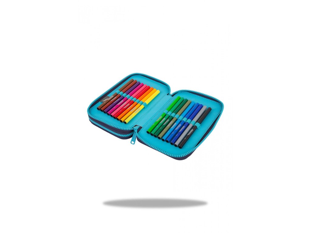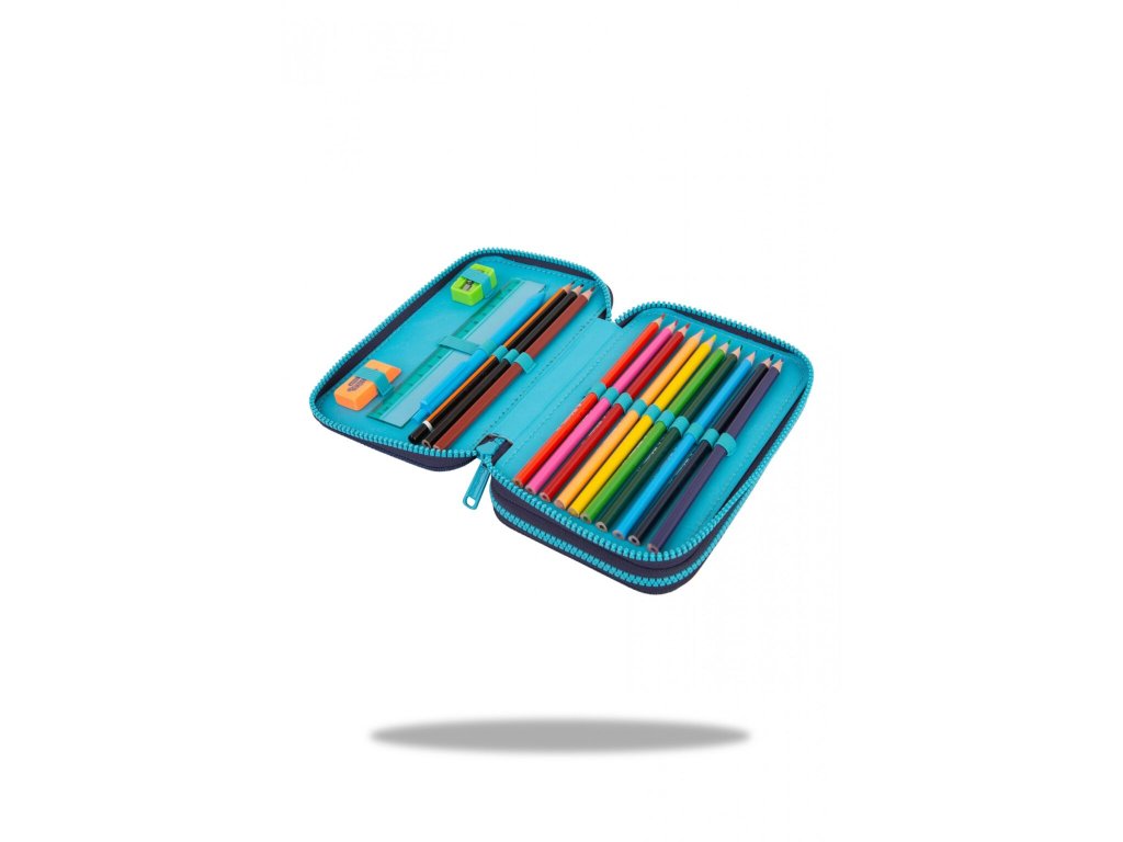 Vybavený 2 zipý školní penál CoolPack Jumper 2 Obsahuje: • trojhranné pastelky Colorino 12 ks • barevné fixy Colorino 18 ks • trojhranná tužka HB Colorino 1 ks • kuličkové pero Patio Base 1 ks • pravítko 15 cm • pryž Colorino • ořezávátkoDoplňkové parametry