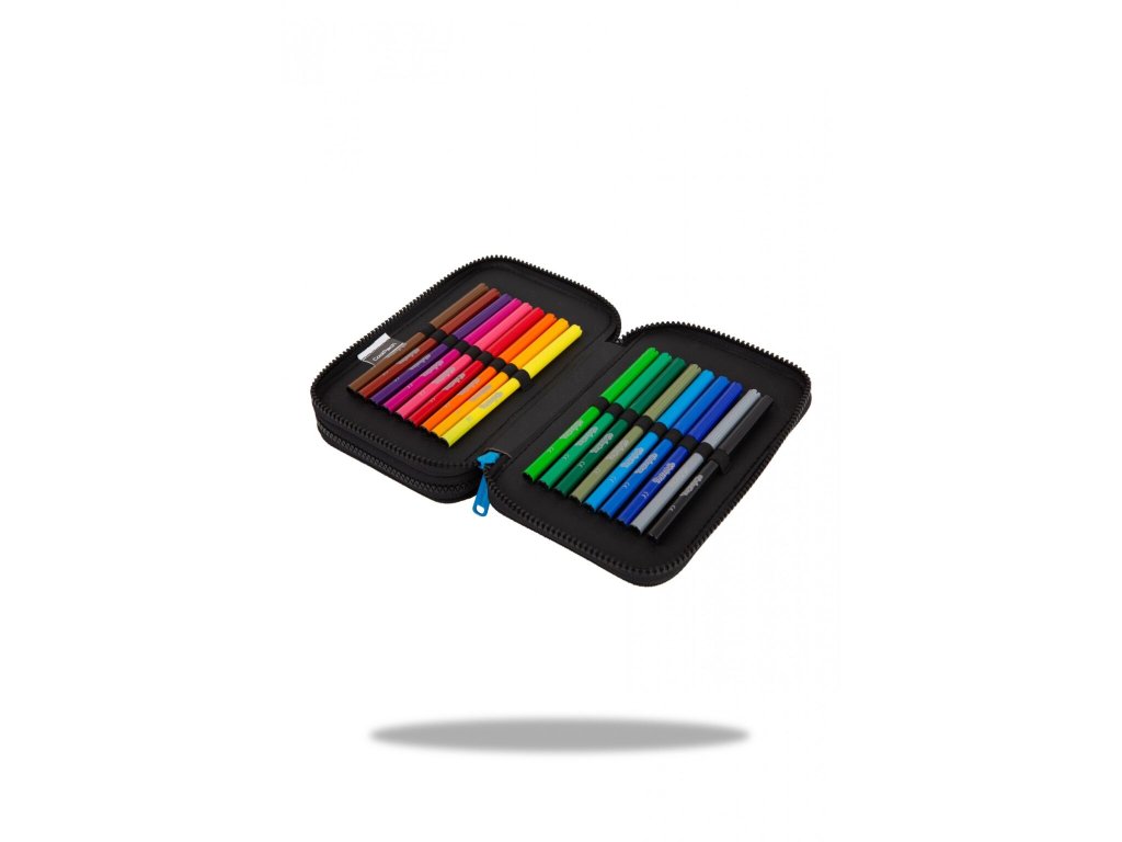 Vybavený 2 zipý školní penál CoolPack Jumper 2 Obsahuje: • trojhranné pastelky Colorino 12 ks • barevné fixy Colorino 18 ks • trojhranná tužka HB Colorino 1 ks • kuličkové pero Patio Base 1 ks • pravítko 15 cm • pryž Colorino • ořezávátkoDoplňkové parametry