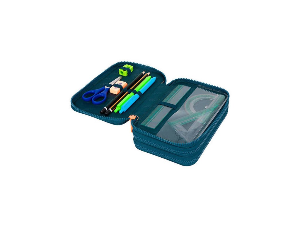 Vybavený 3 zipý školní penál CoolPack Jumper 3 Obsahuje: • trojhranné pastelky Colorino 18 ks • barevné fixy Colorino 18 ks • trojhranná tužka HB Colorino 1 ks • trojhranná tužka 2B Colorino 1 ks • trojhranné gelové pero Colorino 2 ks • pravítko 15 cm • trojúhelník 10 cm • úhloměr 10 cm • nůžky 11 cm • pryž Colorino • ořezávátkoDoplňkové parametry